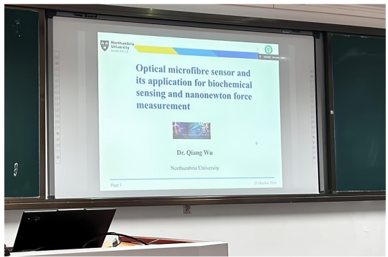荣幸邀请到了英国诺森比亚大学副教授吴强博士为师生们举办了一场主题为“光纤传感器及其在生化传感和纳牛力测量中的应用”的国际专家讲座。