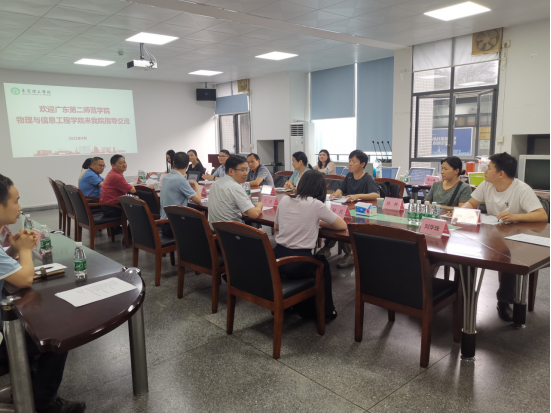2021年4月22日下午,广东第二师范学院物理与信息工程学院杨飒院长一行9人,到电子工程与智能化学院交流座谈,座谈会在电子楼8A207会议室举行,电子工程与智能化学院党委书记兼执行院长胡耀华、副院长宋跃、副院长任斌、副院长胡君,以及电子信息工程系相关负责老师出席了本次座谈会,会议由宋跃主持。