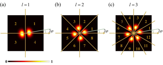 OAM模式具有将旋转角度放大的特性,适合微小角度的精密测量。当OAM模式通过旋转的Dove棱镜时,出射OAM光束相位变化量被放大l倍,其中l为OAM模式的拓扑荷数。相位的测量一般可以通过干涉方法实现,然而干涉仪所处的空间往往充斥着大量的噪声,不得不借助大量的光学以及电子器件通过调制解调、相位锁定等技术去除,成本居高不下。我们提出一种新的方案,将这种相位变化转变为共轭OAM模式叠加态空间分布的变化,并用CCD记录下来,然后通过数字图像法分割空间区域分析光强分布变化,得到与l成正比的分析结果,最后反推出棱镜旋转的角度。此方法光路简单易操作,且不会受到空间噪声的干扰。