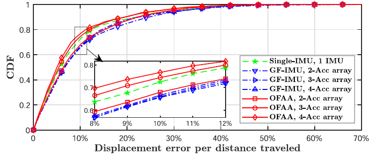 针对传统方法存在的问题,本项工作创新性地提出了无角速度计算的加速度计阵列方案,在保证系统低功耗的同时,降低了系统的累积误差。所提出的算法利用加速度计阵列内的空间几何约束,构建轨迹重建优化问题对最优轨迹点进行求解。本项工作求得了该优化问题的闭式解,大大降低算法的计算复杂度。在实际二维场景的物理实验中,与传统的两种方法相比,所提出的算法具有更高的轨迹重建精度、更低的功耗、更高的可扩展性以及更强的鲁棒性。这些结果表明所提方案相比传统方案更符合新兴应用的需求,非常具有继续深入研究的价值。图1给出了本项工作的物理实验平台,图2给出了各方案的轨迹重建误差对比,图3给出了各方案的累积误差对比。