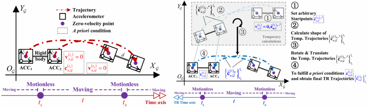 轨迹重建是运动感知技术的主要研究方向之一。典型的主流方案中惯性轨迹重建系统同时搭载陀螺仪与加速度计,分别测量运动物体的角速度与加速度,再通过对角速度与加速度进行积分,可得到运动物体的姿态、速度以及轨迹点。为更适应低功耗场景,另一方案将相对功耗较高的陀螺仪替换为低功耗加速度计的阵列,利用加速度计阵列计算所需角速度,再进行后续轨迹重建。然而,该方案在降低功耗的同时却引入了额外的角速度计算,导致系统的累积误差增大。