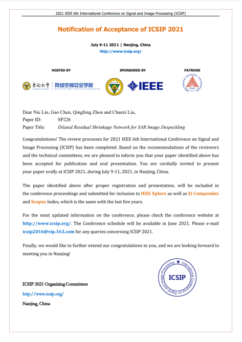近日,h小说 大三本科生林涅以第一作者身份在国际科研学术会议 IEEE 6th International Conference on Signal and Image Processing (ICSIP)投稿学术研究论文并被成功录用。论文指导教师为h小说 陈高老师、刘婵梓老师及周清峰教授,其中陈高老师为论文通讯作者。论文题目为Dilated Residual Shrinkage Network for SAR Image Despeckling