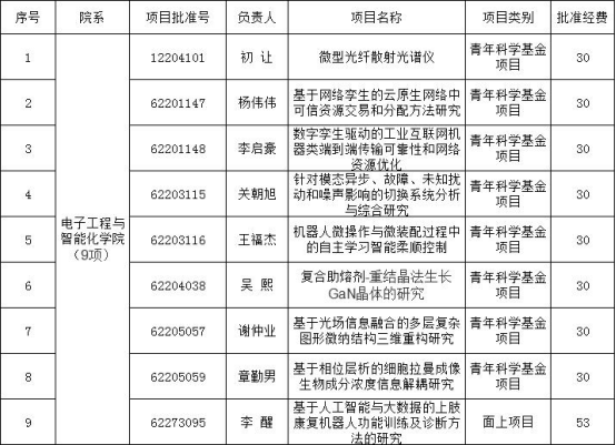 获批立项9项。其中,李醒获面上项目立项,初让、杨伟伟、李启豪、关朝旭、王福杰、吴熙、谢仲业、章勤男8人获青年科学基金项目立项。