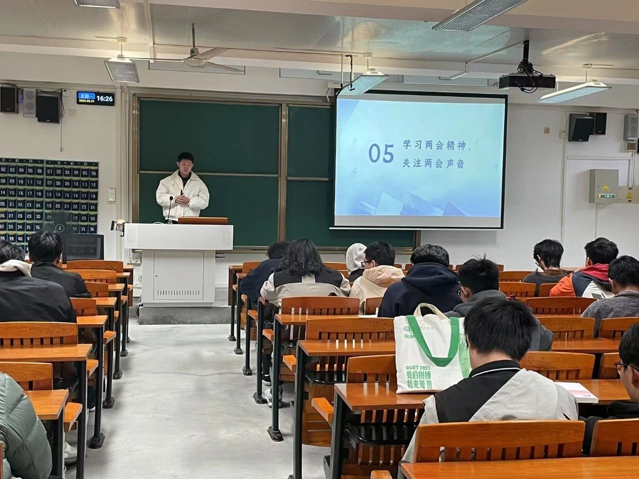 在 “学习两会精神,关注两会声音” 方面,班委鼓励同学们聚焦两会提出的发展目标,认真思考自身能为经济增长贡献的力量。引导同学们密切关注就业、教育等民生福祉议题,深入贯彻创新、协调等新发展理念。强化同学们的责任担当意识,激励大家立足学生本职,为国家发展积极出力。