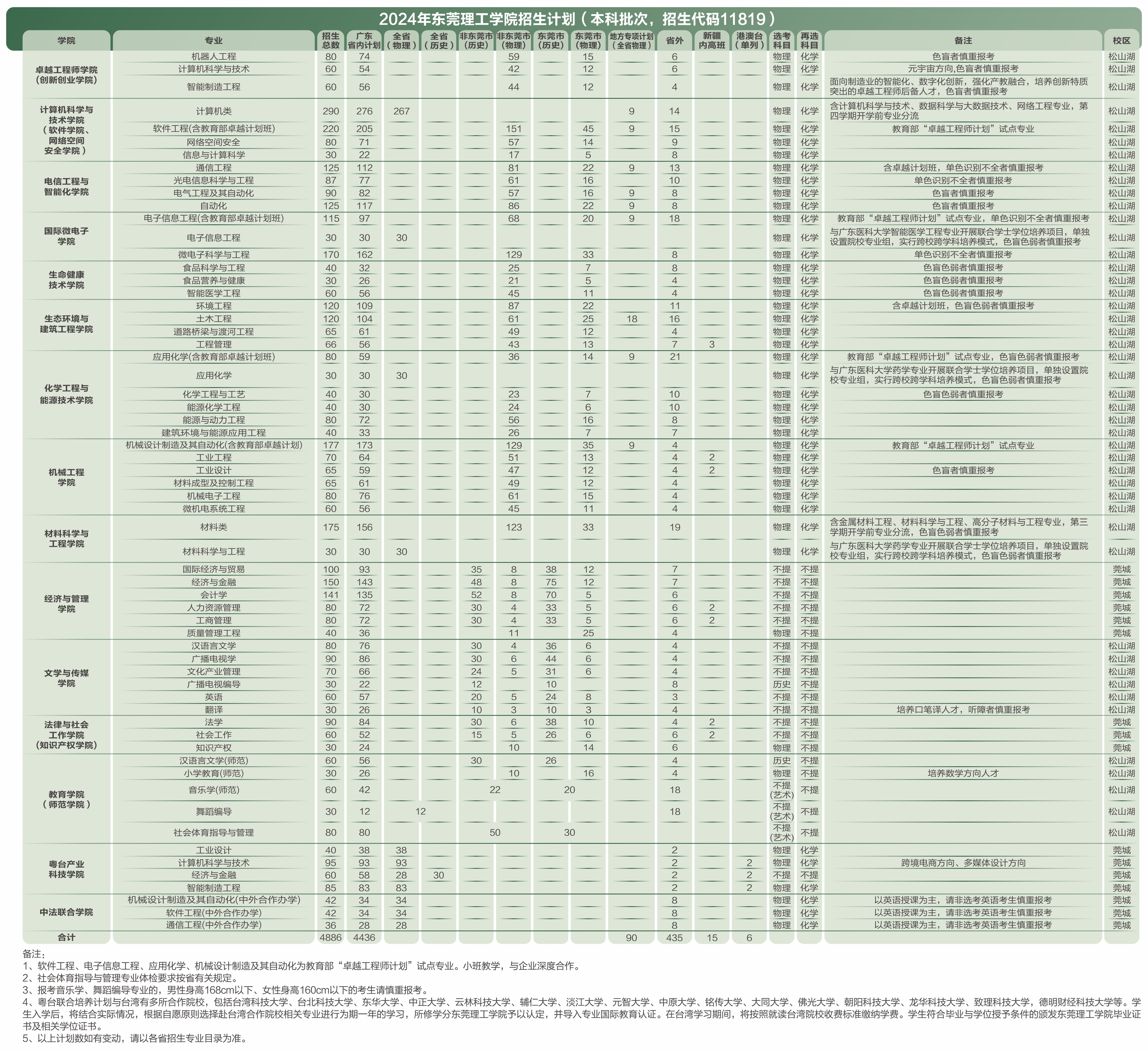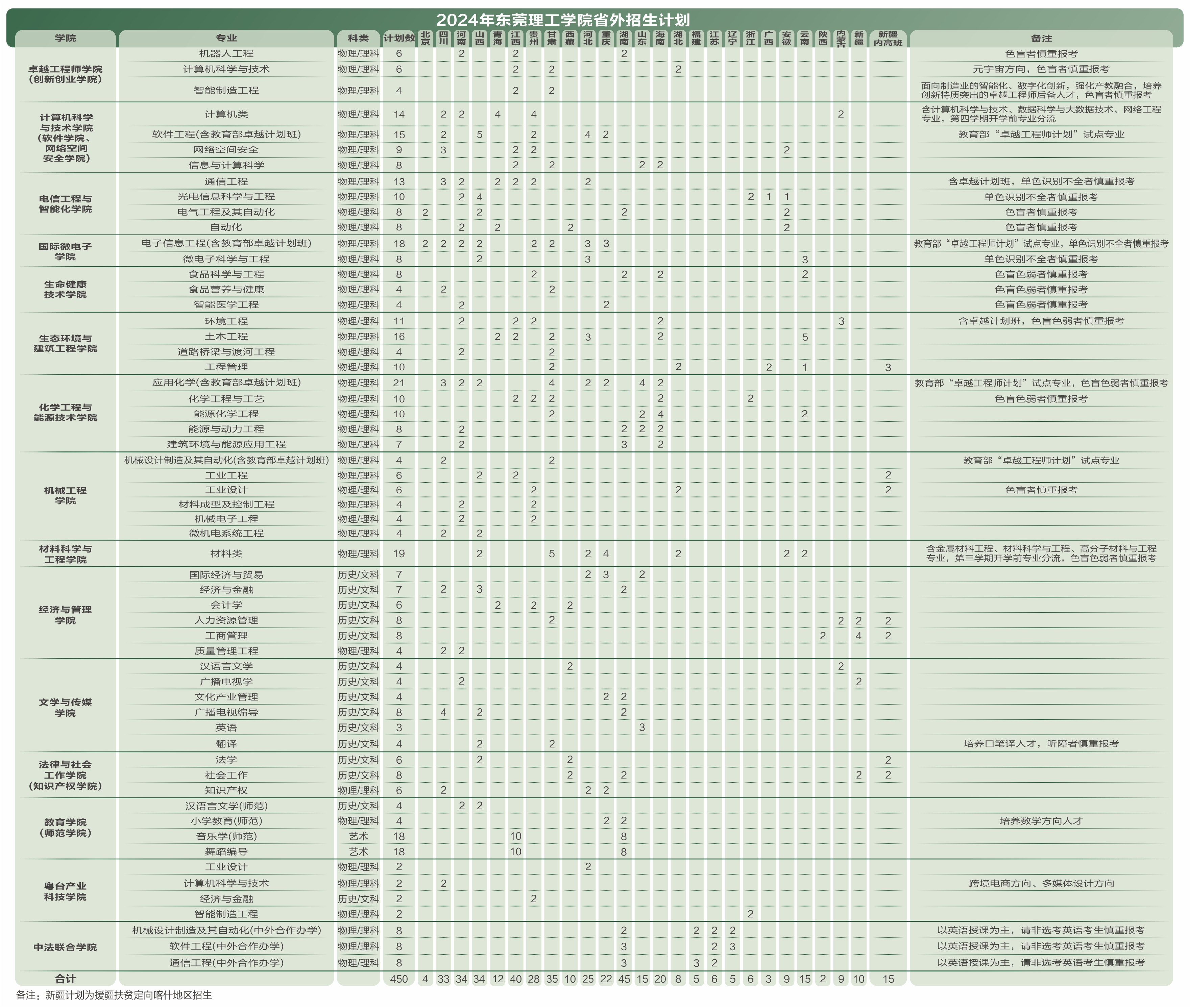 今年,莞工面向广东、北京、江西、海南、贵州、山东、四川、甘肃、河南、河北、重庆、山西、青海、湖南、湖北、广西、安徽、云南、新疆、福建、浙江、陕西、江苏、辽宁、内蒙古、西藏等26个省(自治区、直辖市)拟招生4886人,其中广东省内拟招生4436人,广东省外拟招生450人。