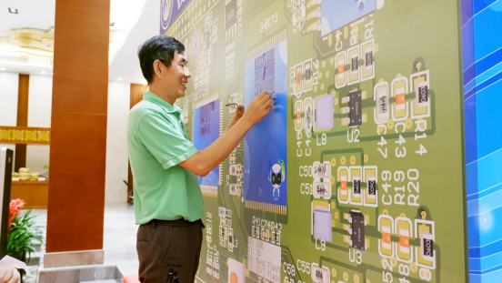 在由学院领导及老师精心设计、以电路图为主背景、体现了电智人的专业元素和特有浪漫情怀的签名墙前,校友们一一签名,并在签名墙前合影留念。