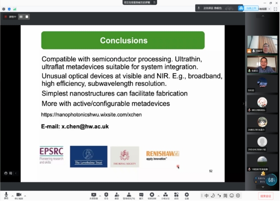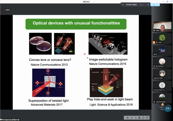 9月9日下午,来自英国Heriot-Watt University 的陈献忠教授在物理与光电工程系的陈晓涌博士和孙敬华教授辅助下,面向全校70余名学生以及部分校外感兴趣的学生学者做了一场关于平面光学器件的精彩在线讲座。报告中,陈教授系统讲解了超表面的基本原理、基于超表面的光场调控、基于超表面的平面光学元器件及其对实际应用的影响。报告后,同学们就学术和学业等问题与陈教授进行了40余分钟的交流。陈教授耐心回答了同学们的提问,包括超表面的原理问题、将来的发展趋势、以及在英国留学的一些基本信息等等。整场讲座信息量非常丰富,同学们收获颇丰。