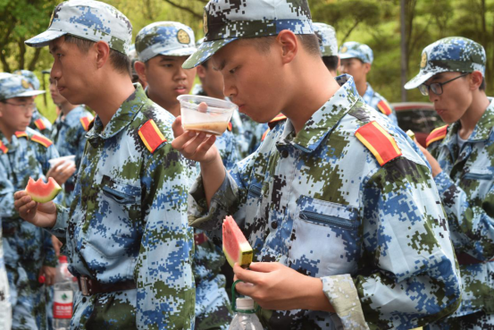 休息时间,“送清凉”活动正式开始。新生们排着整齐的队伍,先是对在场的领导老师们送去了教师节祝福,接着有条不紊的排队领取西瓜和糖水。同学们还主动为带队的教官送去西瓜,感谢教官的辛勤指导。